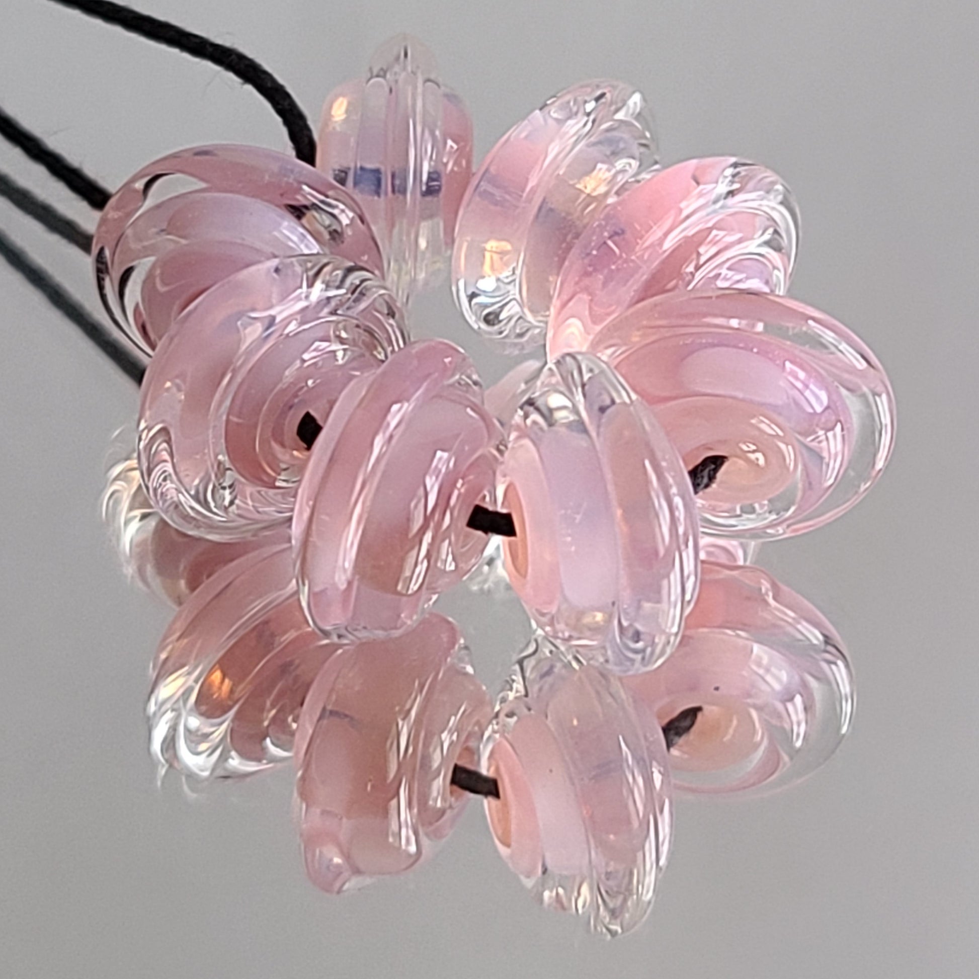 Celebrate delicate beauty with these enchanting Blossom handmade lampwork beads, featuring soft pink glass lovingly encased in crystal clear glass. Each bead is individually crafted by hand over an open flame, creating a stunning dimensional effect where the gentle pink core glows through the transparent outer layer like flower petals caught in morning dew. These artisan glass beads bring romantic elegance and luminous beauty to your jewelry designs.